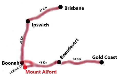 Our 40 acre property at Mount Alford is nestled in a green valley surrounded by the mountain ranges of the stunning scenic rim. Only 10 minutes south of Boonah, just over an hour from Brisbane CBD and roughly 40 minutes from Ipswich. An easy drive on well maintained bitumen roads. The township of Boonah offers genuine country hospitality and charm.